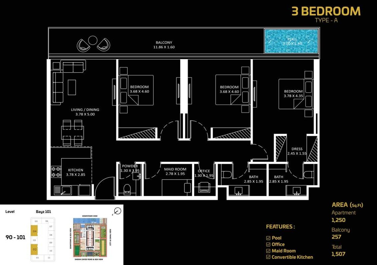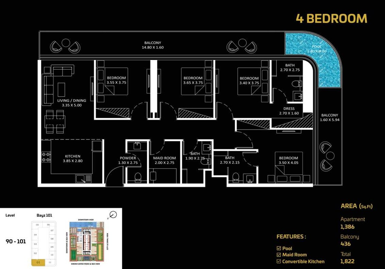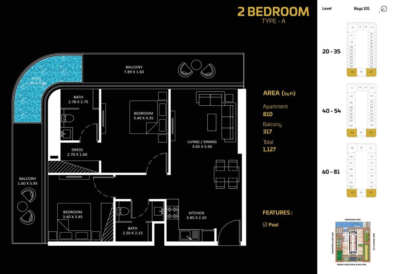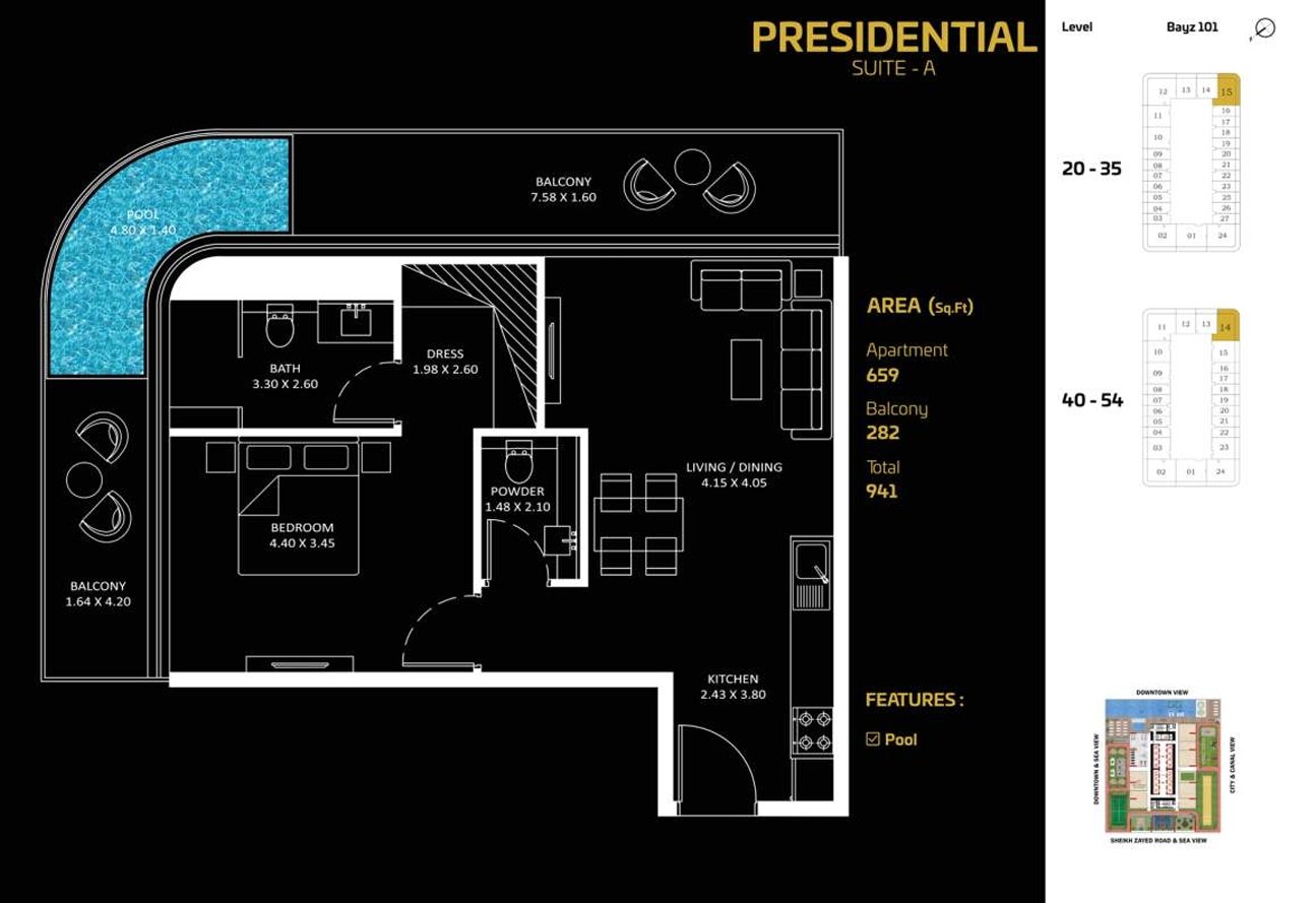 - Prime location in Business Bay with proximity to Sheikh Zayed Road.